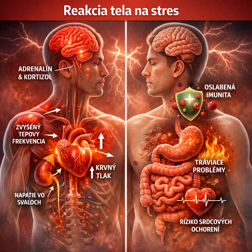 Pri strese sa v tele automaticky aktivuje obranný mechanizmus „bojuj alebo uteč“. Dochádza k vyplavovaniu hormónov, najmä adrenalínukortizolu, ktoré zrýchľujú tep, zvyšujú krvný tlak a presmerujú energiu do svalov. Tento stav je krátkodobo užitočný, no ak pretrváva dlhodobo, môže viesť k oslabeniu imunity, tráviacim ťažkostiam, hormonálnej nerovnováhe či zvýšenému riziku srdcovo-cievnych ochorení.